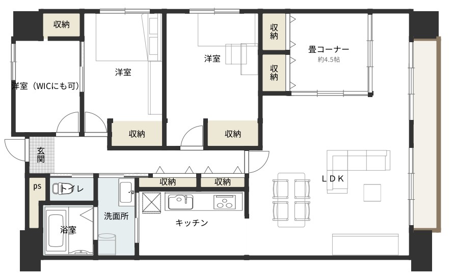 広々としたLDKに加え、洋室・和室をバランスよく配置。家族のライフスタイルに寄り添う、住み心地の良い間取りです。