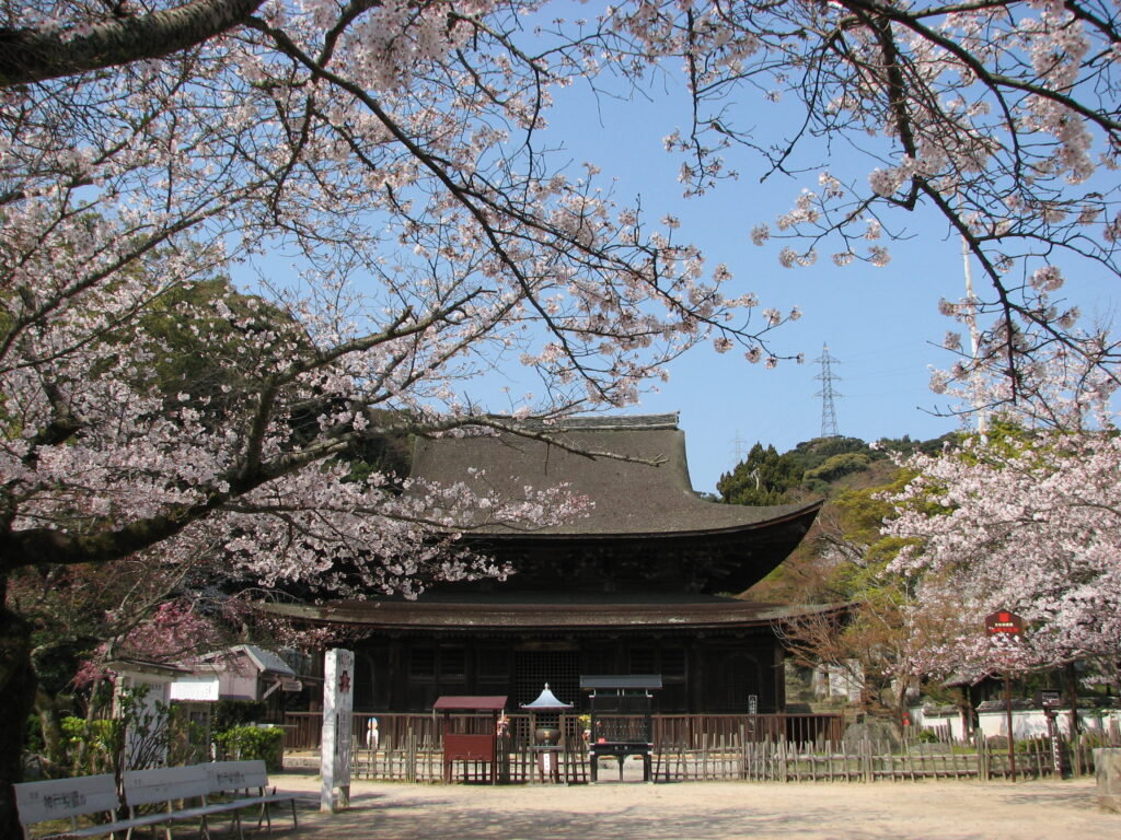 城下町長府の桜の名所といえば、功山寺(こうざんじ)。鎌倉末期創建の曹洞宗の寺院で、桜は大きな古木が多く、満開時、仏殿(国宝)などとの美しいコントラストは見ごたえがあります。桜の種類が多く、ソメイヨシノ、シダレザクラ、ヤエザクラ、ギョイコウ(御衣黄)と次々に咲き、長い期間楽しめます。