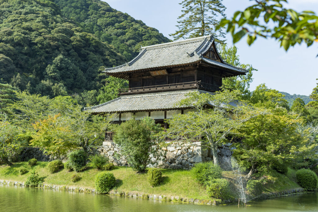 防府天満宮から2kmほどの場所にある毛利氏庭園。約55,000平方メートルの広大な池泉回遊式庭園で、明治・大正期の高度な造園技術により設計され、国指定名勝に登録されています。春は約160本の桜による庭園美が満喫できます。
