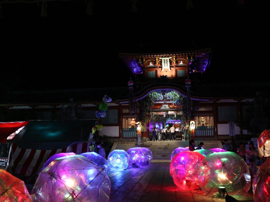 拝殿や境内は傘玉アートに光を灯す「光の斎庭(ゆにわ)」が設けられ、夜間は幻想的な雰囲気に包まれます。期間中は様々なイベントが開催されます。