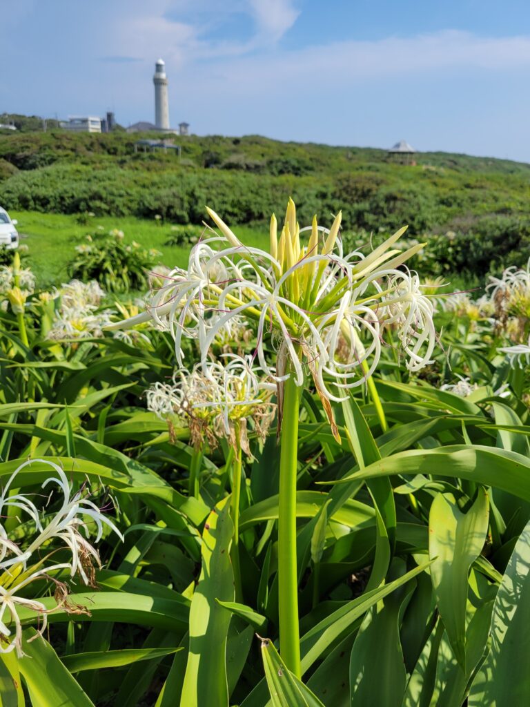 角島灯台公園に隣接した夢崎波(ゆめさきなみ)の公園にはハマユウの群生地があります。