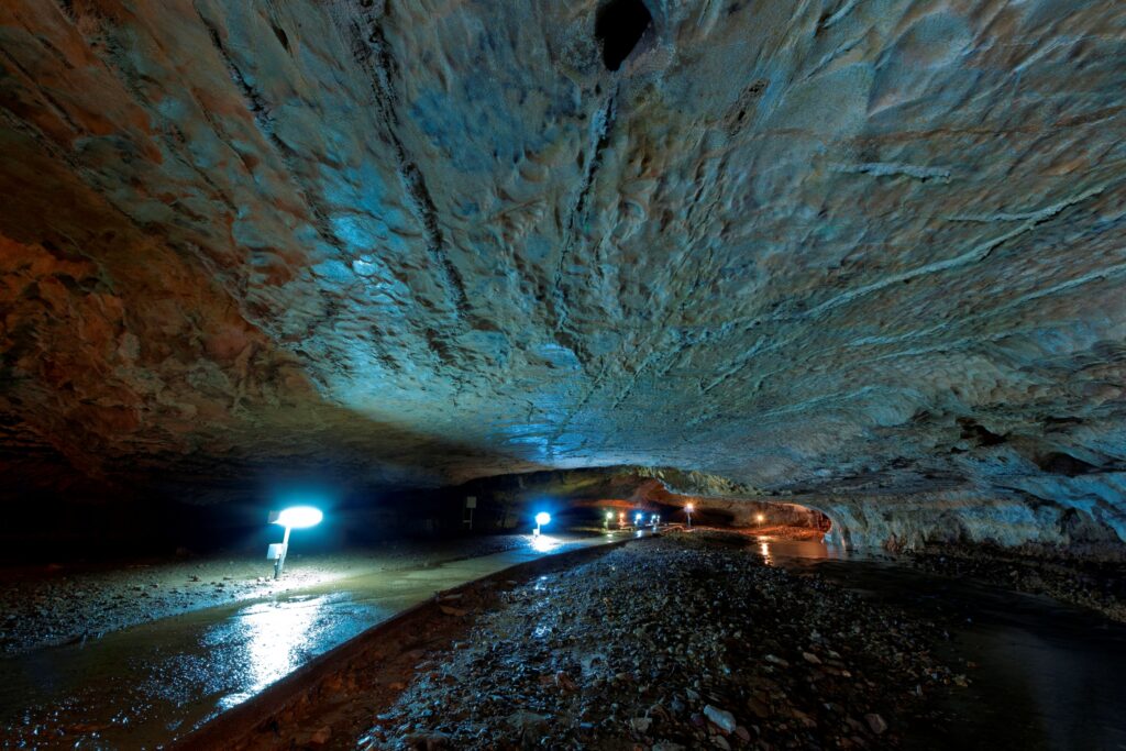 観光コースの終点から先は、約400mの探検コース(有料・予約不要)。暗闇の中をヘッドライトの明かりを頼りに洞窟探検ができます。受付でヘルメット、ヘッドライト、長靴を借りられます。所要時間は約60分。