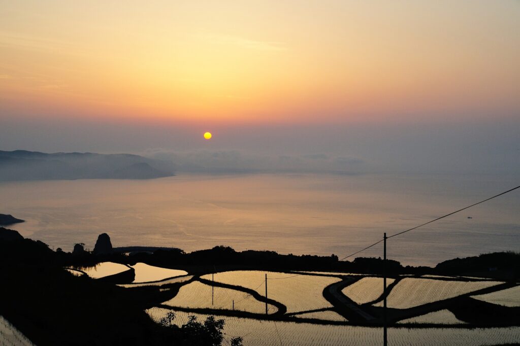 田に水を張る4月下旬以降には、水田が鏡のように空を映し、ひときわ美しい情景に。特に、日没前後のマジックアワーの、空と海と棚田がつくり出す風景は見ごたえがあります。