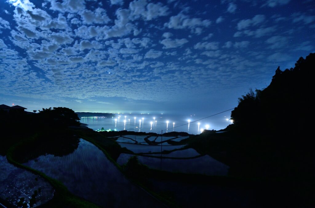 漁火が輝く幻想的な夕景で有名、東後畑棚田