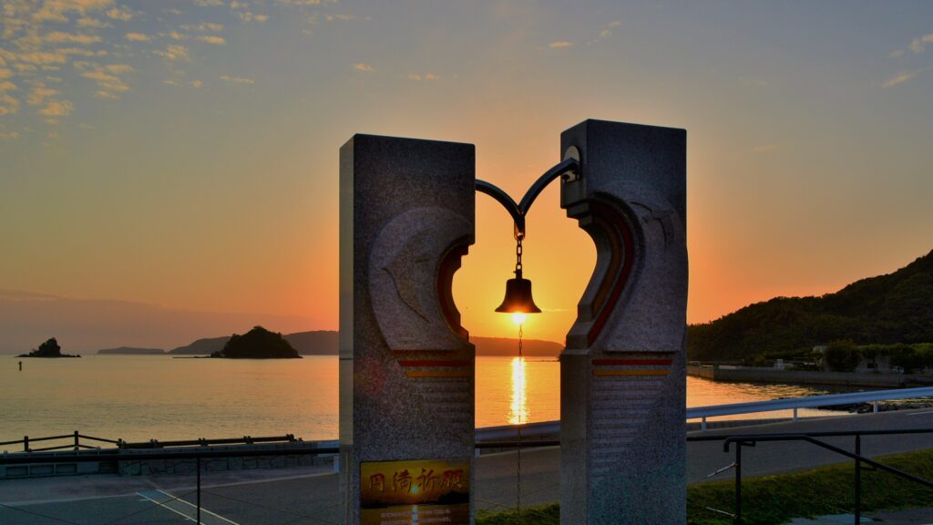 日本海のそばの道の駅 阿武町では、美しい夕景が見られます。特に、カップルやファミリーが鐘を鳴らして幸せを祈る「幸せのモニュメント」は、夕焼けに映える景色で撮影スポットとして人気です。