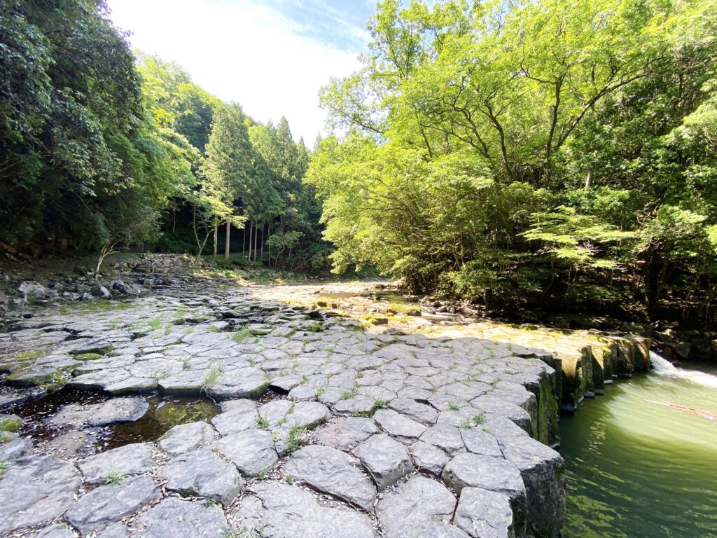 畳ヶ淵も龍が通った道の火山地形のひとつ。溶岩流が冷え固まってできた六角形の岩石を敷き詰めたような川原と、そそり立つ石柱(柱状節理)が、神秘的な光景をつくりだしています。