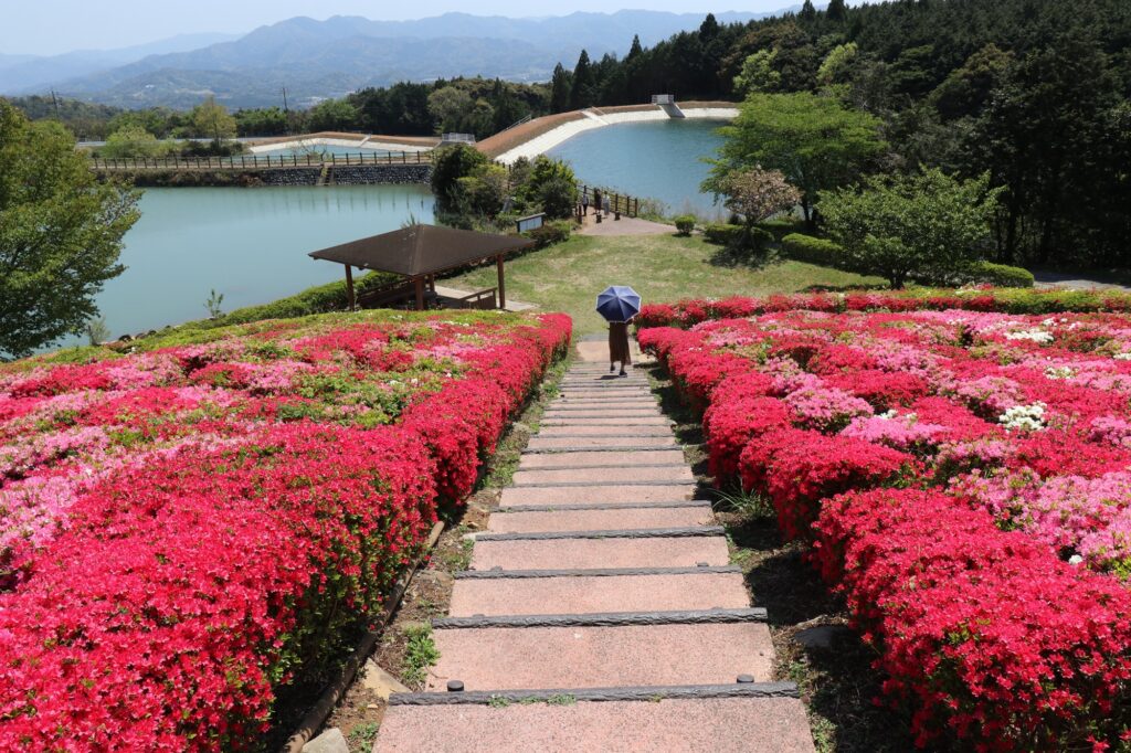 日本海側の人気スポット、元乃隅神社から車で10分ほどの菅無田(すげむた)公園。約1万8千本のキリシマツツジの赤、白、ピンクの花が、「いろどりの丘」を埋め尽くす景色が見事です。見ごろは4月下旬~5月初旬。農業用ため池を整備した親水公園で、池の周りの遊歩道で散策も楽しめます。