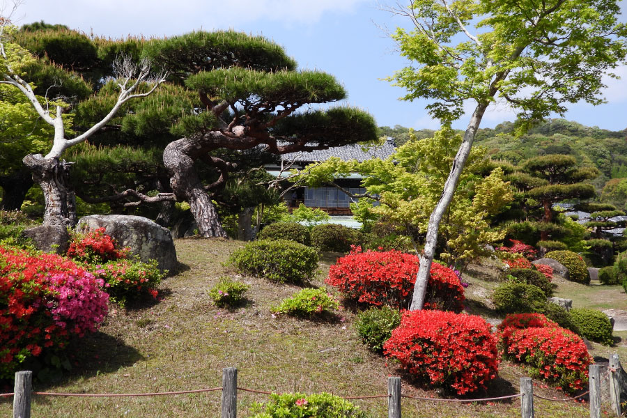 新緑と季節の花の雅な共演、毛利氏庭園(防府市)