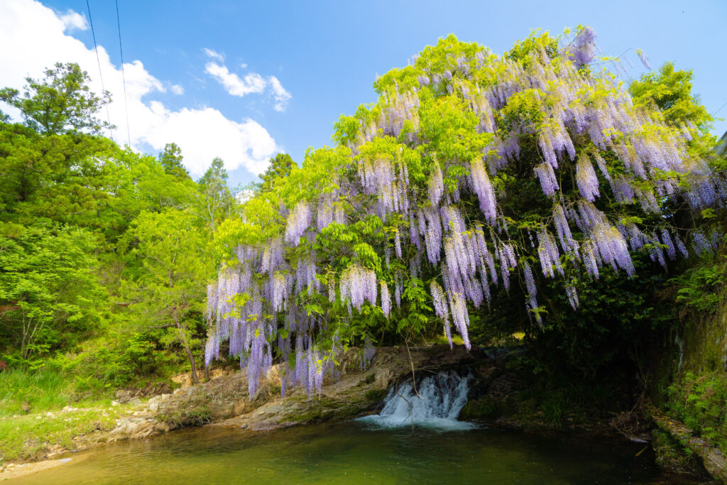 山口市中部の山間にある仁保一貫野(にほいっかんの)地区で大切に守られている藤の大木。川沿いに自生し、満開時には川面に向かって花房が垂れ下がり、幻想的な光景をつくりだします。見ごろは5月上旬。山口市街地から車で30分ほどの場所です。
