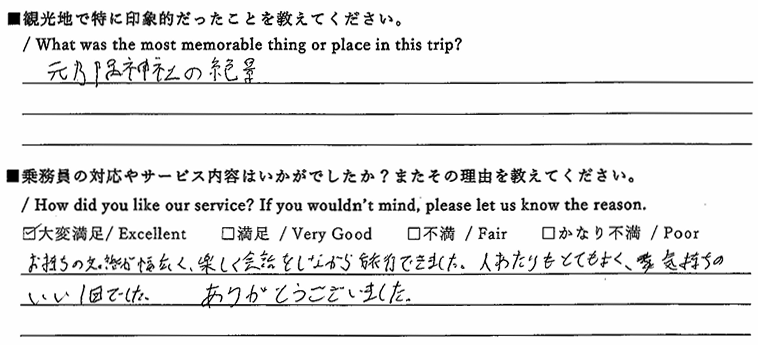 - お持ちの知識が幅広く、楽しく会話をしながら旅行できました。人当たりもとてもよく、気持ちのいい一日でした。ありがとうございました。
